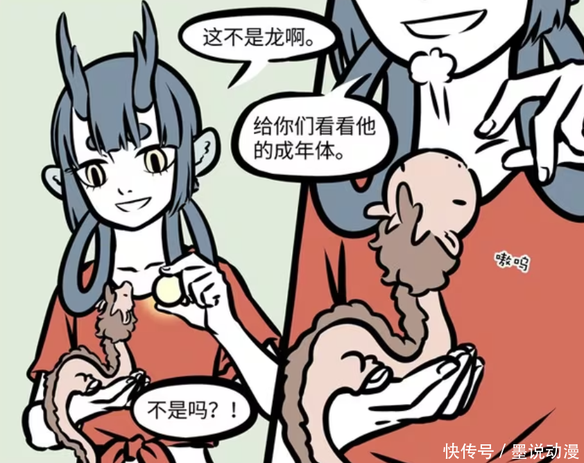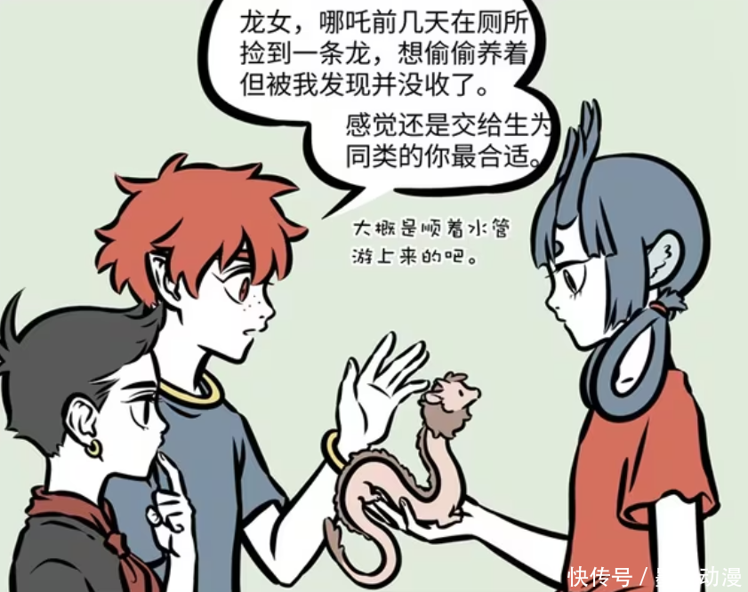 红孩儿告诉龙女,哪吒前几天在厕所捡到了一条龙。原本想要偷偷收养,但被他发现。红孩儿觉得,养龙这种事情,还是交给龙女最为合适。另外红孩儿觉得,这条龙应该是顺着水管游上来的,所以才会被哪吒发现。