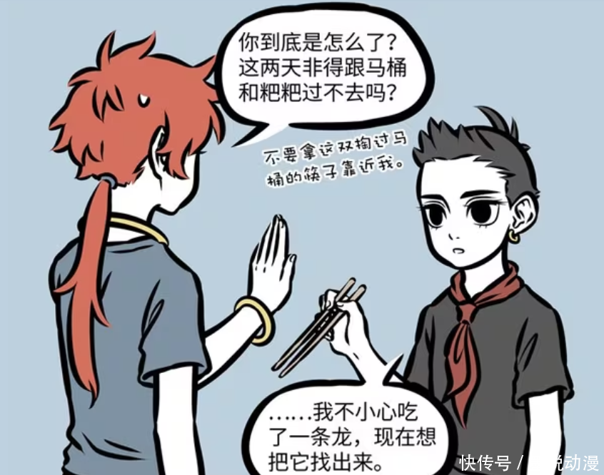 红孩儿不知道哪吒这两天到底是怎么回事?为何跟马桶和粑粑过不去。看到哪吒拿着筷子,红孩儿很嫌弃,让哪吒不要靠近他。哪吒告诉红孩儿真相,那是因为他不小心吃掉了一条龙,现在哪吒只想把它找出来。